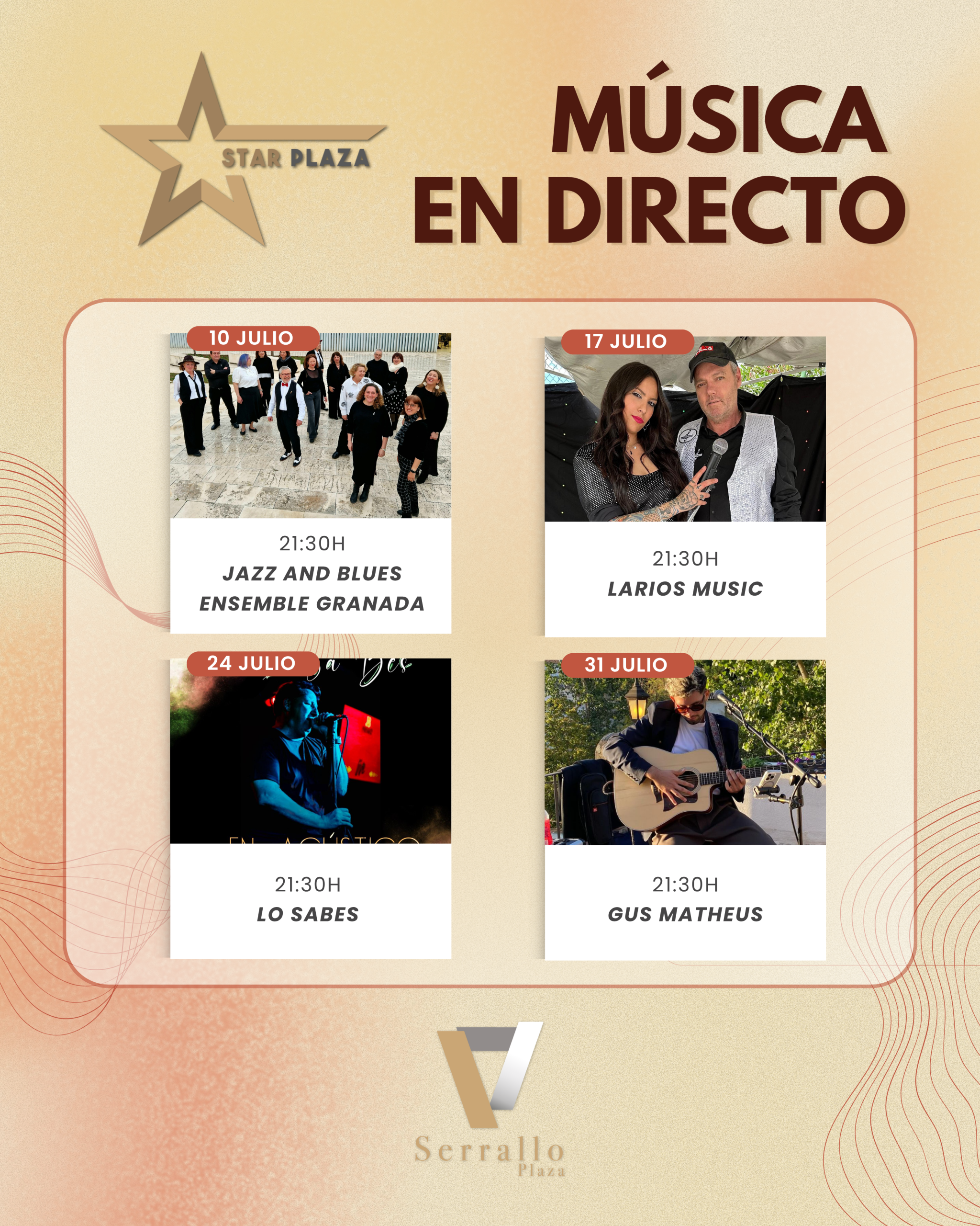 Este verano, disfruta de las mejores noches de música en vivo en Star Plaza, la terraza de Serrallo Plaza. Cada miércoles a las 21:30h, déjate llevar por el talento de artistas únicos en un ambiente inmejorable.🔹 10 de julioJazz and Blues Ensemble GranadaUna velada llena de ritmo con la elegancia del jazz y la fuerza del blues interpretados por una gran formación. 🔹 17 de julioLarios MusicUn dúo versátil que versiona grandes éxitos con un estilo fresco y personal. 🔹 24 de...