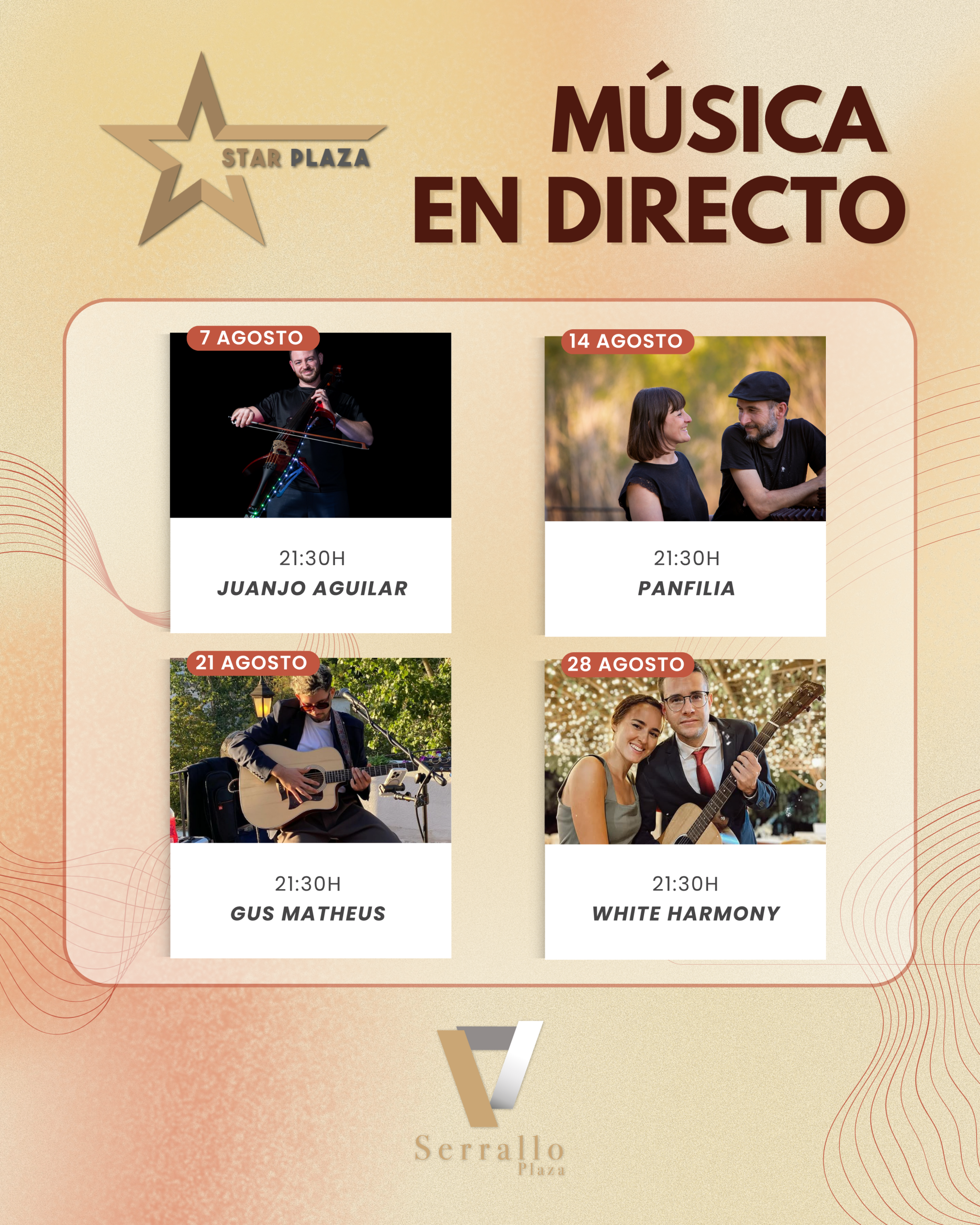 Este verano, disfruta de las mejores noches de música en vivo en Star Plaza, la terraza de Serrallo Plaza. Cada miércoles a las 21:30h, déjate llevar por el talento de artistas únicos en un ambiente inmejorable. 📅 Programación de Agosto 🔹 7 de agostoJuanjo AguilarEspectacular violín eléctrico en un directo lleno de energía y sorpresas. 🔹 14 de agostoPanfiliaDúo con sonidos delicados y cercanos que te enamorarán. 🔹 21 de agostoGus MatheusVuelve a deleitarnos con su música en directo. 🔹 28 de agostoWhite HarmonyUn dúo...